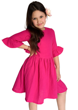 Przyjemna w dotyku sukienka, uszyta z miękkiej bawełny MUŚLIN - DOUBLE GAUZE-  (Oeko-Tex Standard 100), naturalnej i bardzo dobrej jakościowo tkaniny, która zapewni komfort i idealną termoregulację ciała dziecka. Sukienka z 3/4 rękawem, wiązana na plecach.  Wyjątkowo delikatny materiał sprawia, że jest ona bardzo zwiewna i dziewczęca. Delikatne zdobienie przy rękawy w postaci falbanki dodaje jej wyjątkowego szyku.